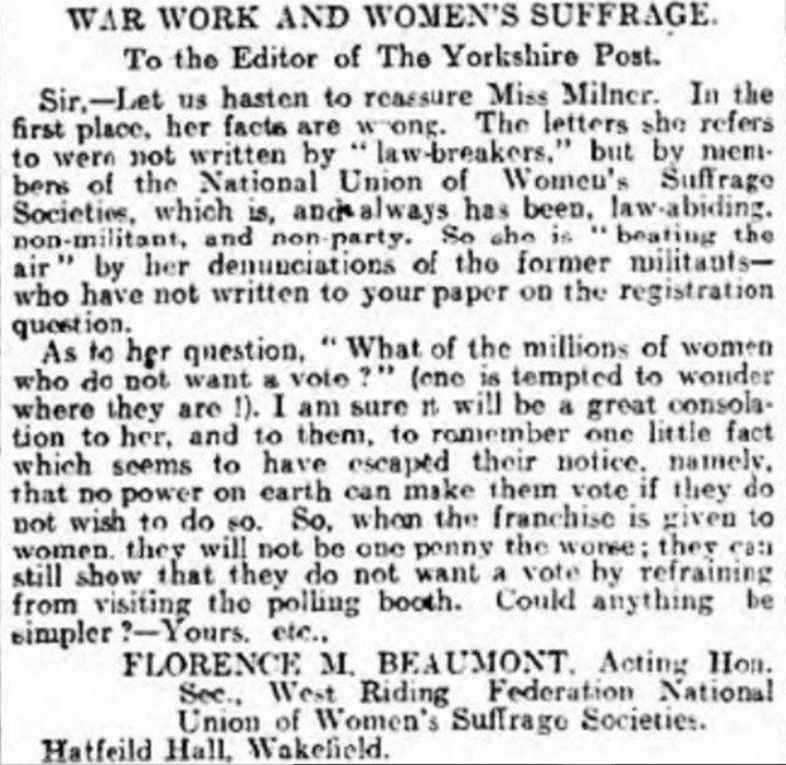 Florence established the Wakefield Branch of the National Union of Women’s Suffragist Societies in the drawing room at Hatfield Hall in 1910. She was a prolific writer to the local newspapers, penning such correspondence as the example below.
